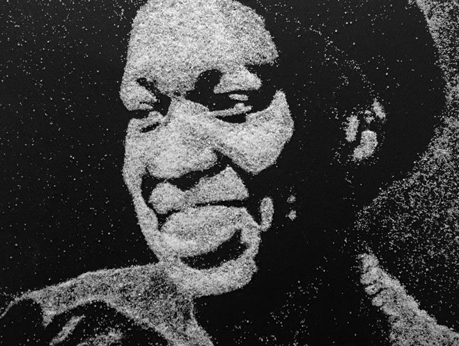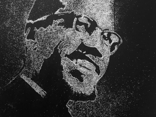 It was created using salt on paper to explore the idea of Impermanence in the process. Once the illustration was complete the salt was used for a new portrait.